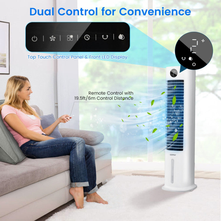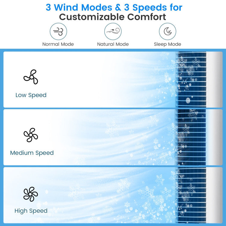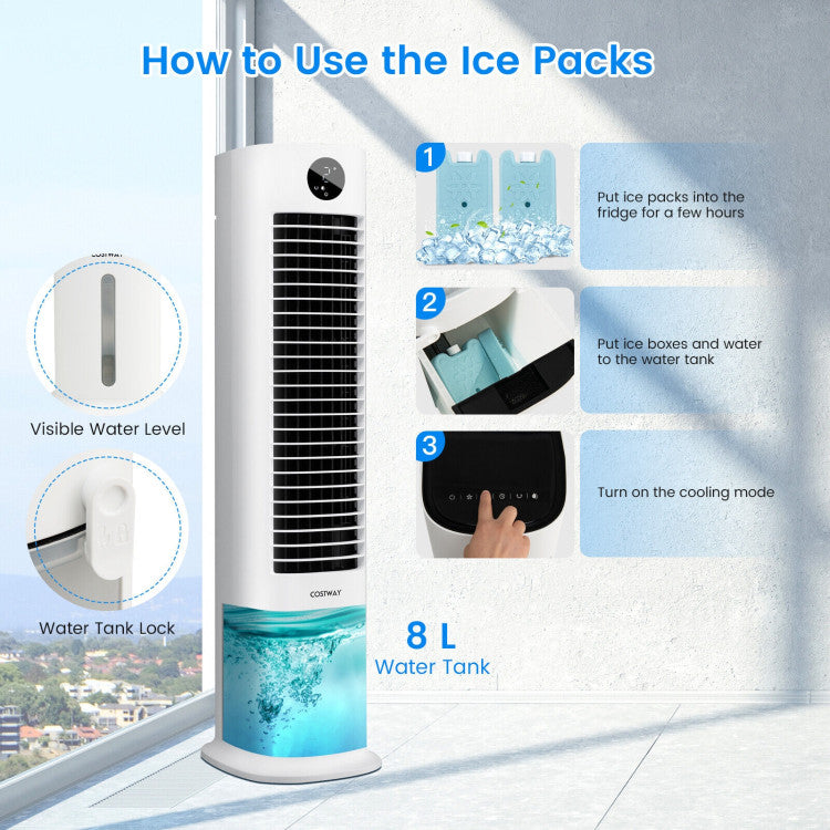 This multifunctional evaporative air cooling fan can be used as a fan, air cooler and humidifier. Equipped with 3 wind modes, 3 speeds and an 80°oscillating function, this tower air cooling fan can offer you customizable airflow in a wider coverage area. You can add water and ice boxes to the water tank, then turn on the cooling mode to enjoy coolness in seconds. The 2.1-gallon water tank can greatly reduce the frequency of adding water. And the visible water level can clearly show the remaining water information. Thanks to the 1-9h timer and quiet operation, you will get a cool and peaceful sleep at night. Besides, you can control all the settings conveniently through the handy remote control and smart touch panel. 4 universal wheels and the back built-in handle allow you to move or carry the air cooler to any place with ease.