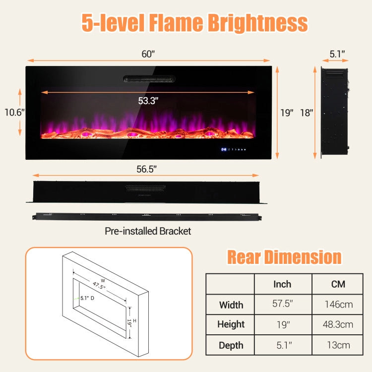 50/60 Inch Wall Mounted Recessed Electric Fireplace Heater with Remote Control and Touch Screen