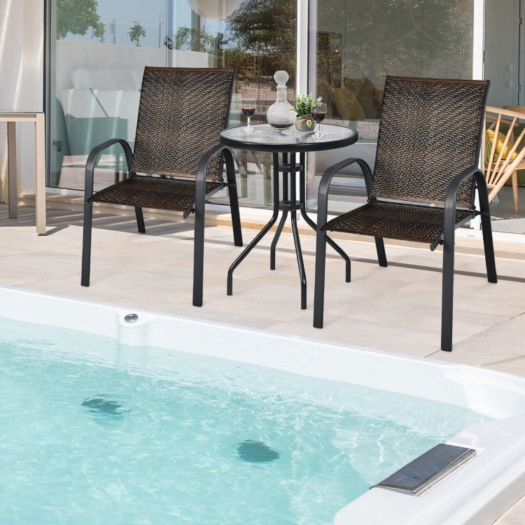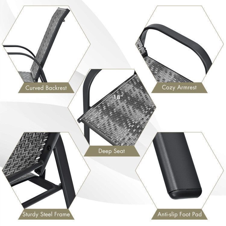 Enjoy a delicious meal while sitting on these outdoor dining chairs! For comfort, these patio chairs are ergonomically designed with a curved back, comfortable armrests, and a deep seat for a comfortable sitting experience. Besides, the all-weather PE wicker and sturdy steel frame make these outdoor armchairs durable and stable for extended use. So whether you place them on the patio, garden, or poolside, these chairs will support you stably. If you don't need these patio dining chairs, just stack them for easy storage and space-saving.